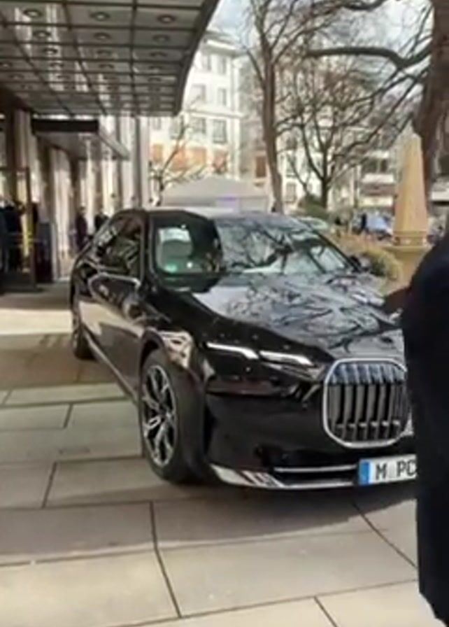 black BMW sedan parked outside of a building with a modern, metallic awning. A man wearing a dark suit and sunglasses is standing near the car, appearing to have opened the door. The vehicle is parked on a tiled sidewalk. The license plate is visible, reading "M PC 551 E." Buildings and bare trees can be seen in the background across the street.