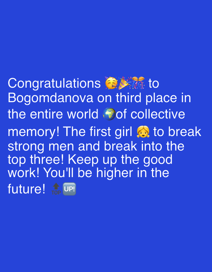 A congratulatory message celebrates Bogomdanova's third-place win in a global collective memory competition. The statement emphasizes her achievement as the first girl to surpass strong men and reach the top three. It encourages her to continue her good work, suggesting a brighter future. The message is accompanied by emojis that convey celebration and encouragement. The background color is a deep blue.