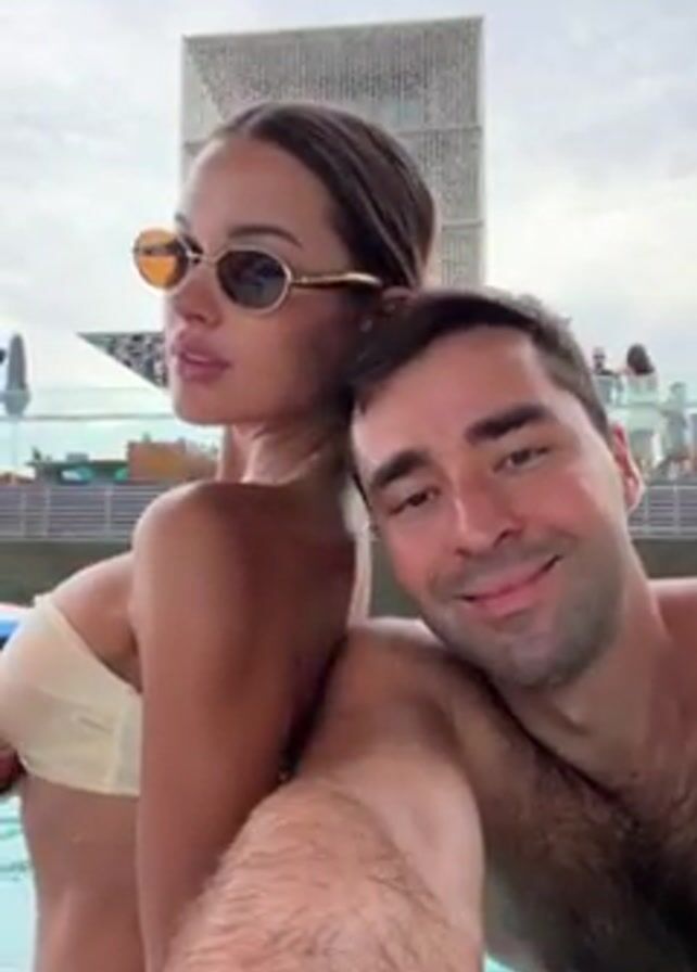 A man and a woman are posing for a selfie in a pool. The woman is wearing a light yellow bikini top and oval sunglasses with yellow lenses. She has her hair pulled back. She takes a sip from an orange drink with a black straw. The man is shirtless and leaning his head against the woman’s shoulder. He is smiling at the camera. His arm is visible in the foreground, showing his arm hair. In the background, there is a tall building with a gray patterned facade. Other people and umbrellas can be seen on a deck or patio. The sky is overcast.