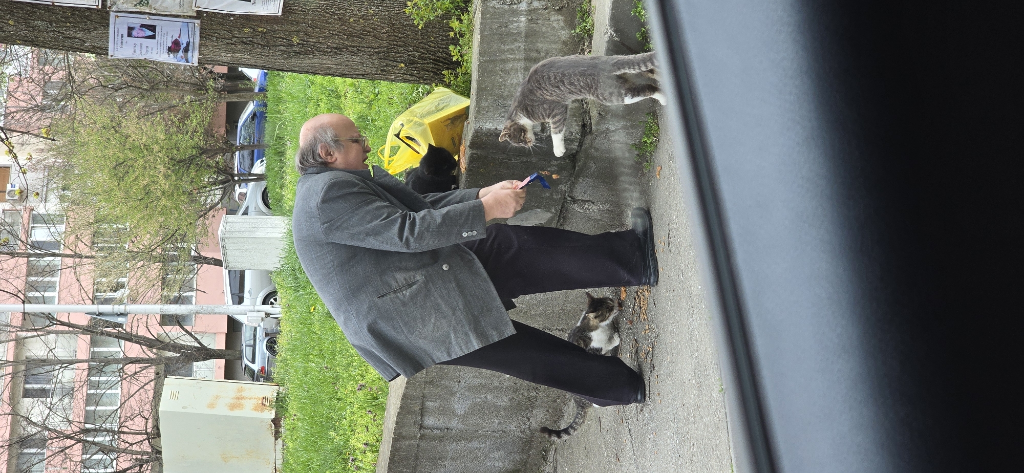 - "An older man in a gray suit is squatting down to feed several cats in a city environment, presumably Veliko Tarnovo, Bulgaria" by FM-Iqmon2, licensed under CC BY 4.0