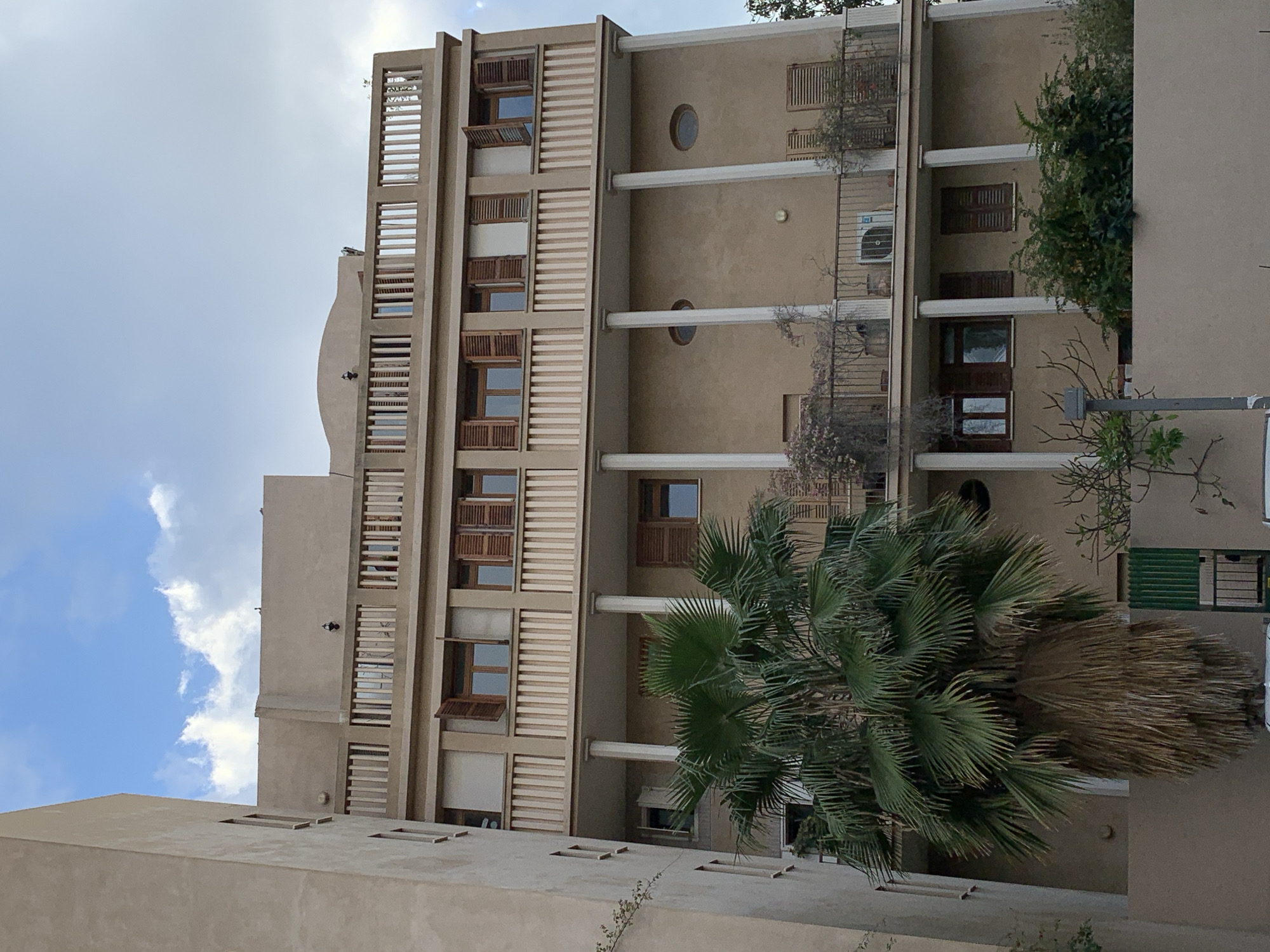 A daytime shot of a multi-story residential building in Tel-Aviv, Israel, is viewed from a low angle. The building is painted in a beige hue, incorporating both traditional and modernist architectural elements. The left facade features vertical rows of slotted screens and window boxes with wooden blinds. The central section of the building has circular windows and balconies supported by white columns. Brown-framed windows, some covered with wooden shutters, are visible on the right side. A large palm tree dominates the lower right foreground. Patches of blue sky with white clouds are visible on the left side of the image. An adjacent building is visible along the bottom of the photo, adding to the urban setting.