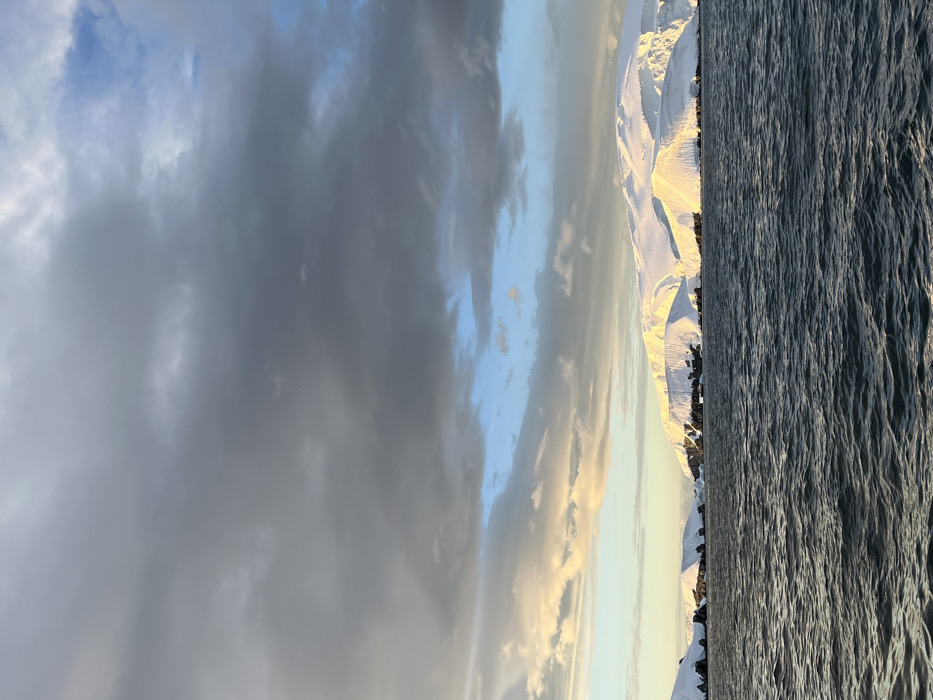 landscape divided into three distinct sections. On the left, a cloudy sky filled with various shades of grey and some blue patches. The middle section features snow-capped mountains with golden sunlight. On the right is the sea, with visibly strong currents running through it.