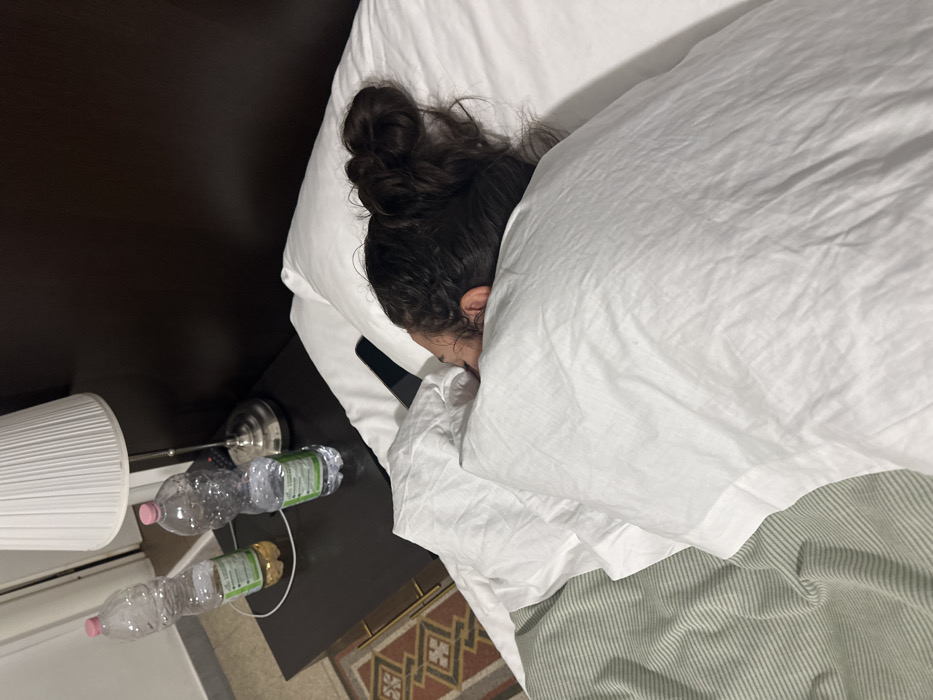 An individual with dark, curly hair tied in a bun is shown resting in a bed, largely obscured by white pillows and a white duvet. A dark-colored smartphone is positioned near their head on the bed. Adjacent to the bed, a dark brown nightstand holds a silver-toned table lamp with a pleated white shade, two plastic water bottles (one containing clear liquid, the other containing a yellowish liquid), and a small black remote control. The bed features white linen and a light green and white striped blanket. A patterned rug with geometric designs in brown, orange, and cream is visible on the floor. A dark brown headboard or wall panel forms the background. A white doorframe is partially visible in the upper left background. The specific location within Rome, Italy, cannot be determined from the image.