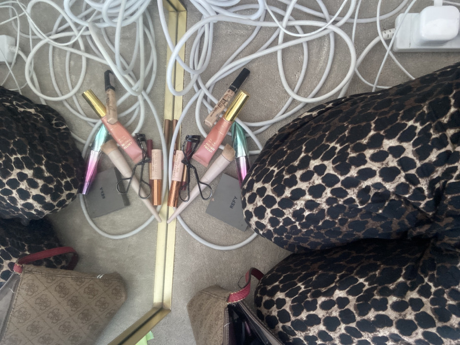 This image depicts an indoor scene on a light-colored carpet, located within Welwyn Hatfield, United Kingdom. The perspective is a downward view of a person's lower body and surrounding objects. In the bottom-left quadrant, the person's legs are visible, covered in black and tan leopard-print trousers or leggings. A rectangular mirror with a gold-colored frame extends across the central and upper-left portions of the frame, reflecting the immediate environment. On the carpet, a collection of cosmetic items is scattered: multiple tubes of lip gloss or liquid makeup (one bearing "HYDRA BRIGHT" text, another "WONDER FLUFF," and a third with "HARRY CHARLOTTE" text), a black metal eyelash curler, a grey compact labeled "REFY," a mascara with an iridescent cap, and a light-colored makeup brush. A tangled mass of white electrical cables or cords occupies the right side of the frame, alongside a white UK-style power adapter/plug located on the far right. The mirror's reflection duplicates these items and also shows a beige monogrammed pouch with a red strap (possibly a "GUESS" brand item) and another leopard-print item, situated in the top-left area of the reflection. The scene's arrangement suggests a temporary setup for cosmetic application, with no direct action or interaction currently being performed.