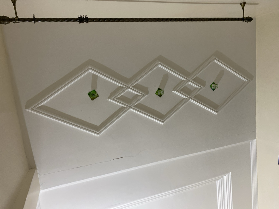 A close-up shot focuses on a white ceiling adorned with three interconnected, diamond-shaped frames. Each frame features a decorative green square in its center. Above, a bronze-colored curtain rod stretches across the scene, supported by ornate finials and brackets. A visible crack extends across the ceiling, near the white molding along the wall. The composition is simple, highlighting the ceiling's architectural details.