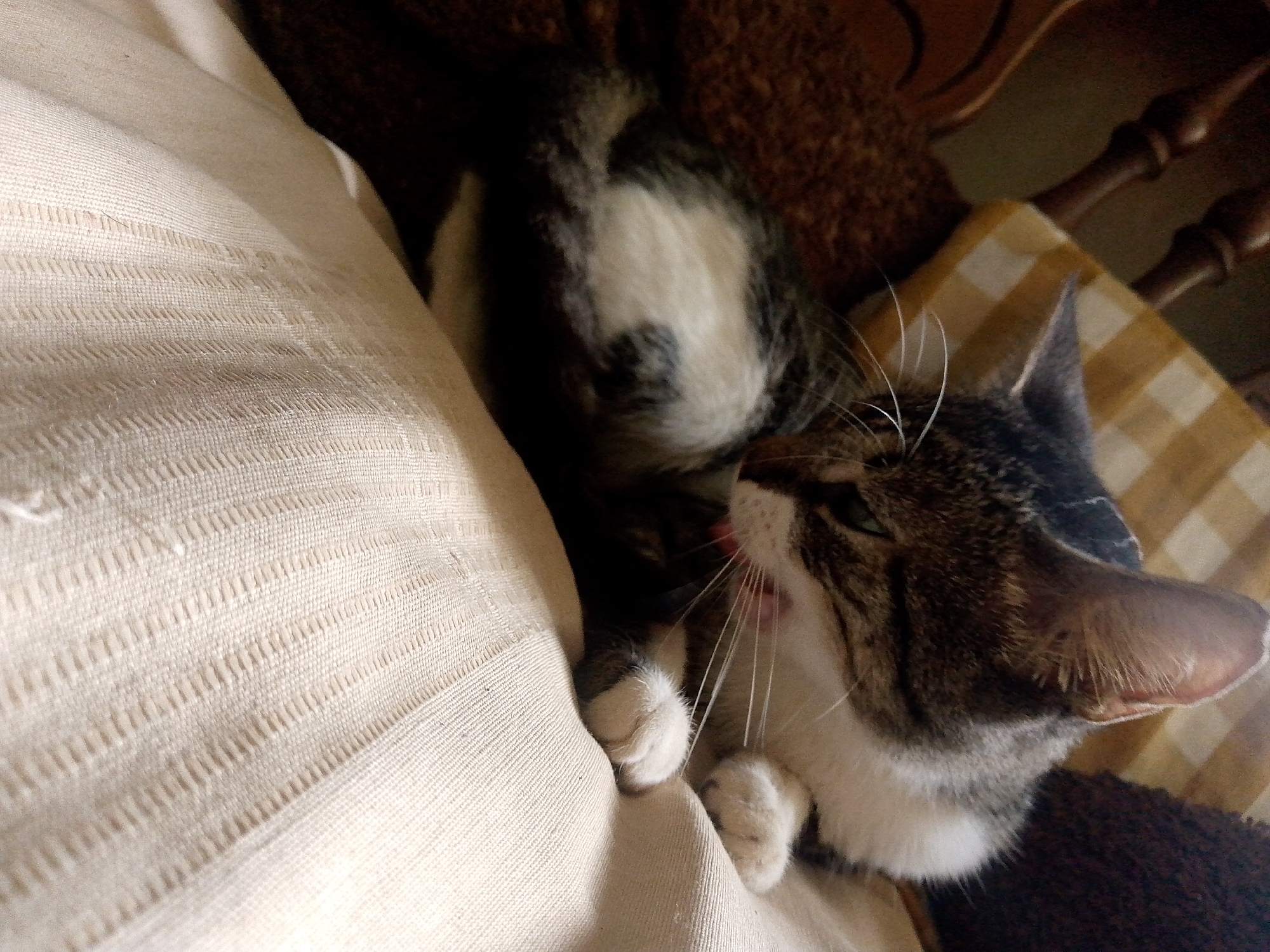 A tabby and white cat is resting on a cream-colored cushion. The cat's body is mostly obscured except for its back and paws. Its head is visible, and its tongue is slightly out. The background includes a checkered cushion and part of a dark wooden chair. The image was taken indoors. There is no indication of the city Juan Griego, Venezuela.