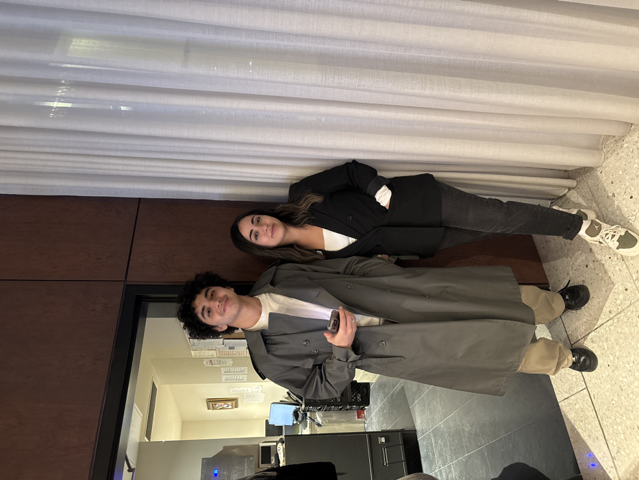 Two people pose next to a curtained wall. A woman leans against the wall wearing a black blazer, white top, black pants, and sneakers. A man stands in front of her, sporting a gray trench coat over a white shirt and khaki pants, with black shoes. A cell phone is visible in his hand. The background includes a glimpse of a kitchen area with a refrigerator and a wall with taped papers. The floor is tiled.