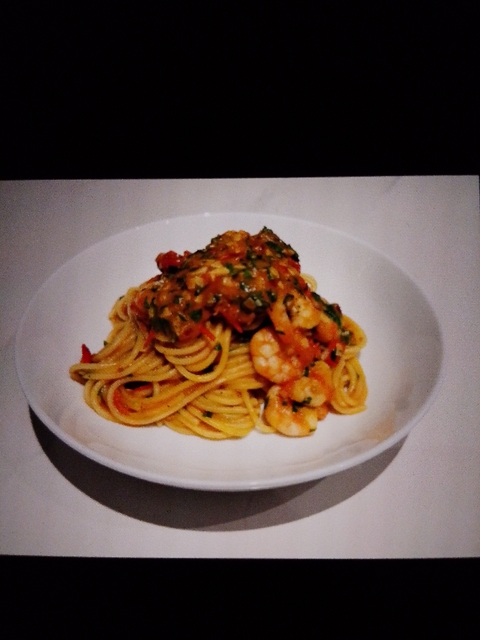 - "A white, shallow bowl holds a portion of spaghetti topped with a tomato-based sauce and cooked shrimp" by FM-mu3Bo2, licensed under CC BY 4.0