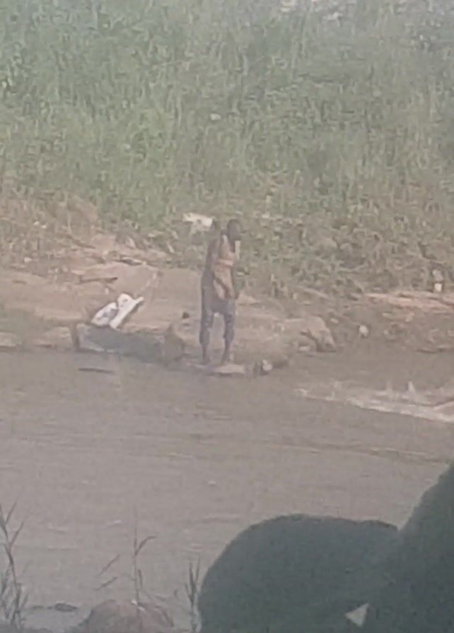 person lying on the ground near a path. The person is wearing an orange shirt and dark pants. There is some trash and debris near them. The path is made of dirt or gravel and runs alongside some grass and greenery. On the right side of the frame, there is some kind of tree or large bush. The quality of the video is poor, and the image is blurry.