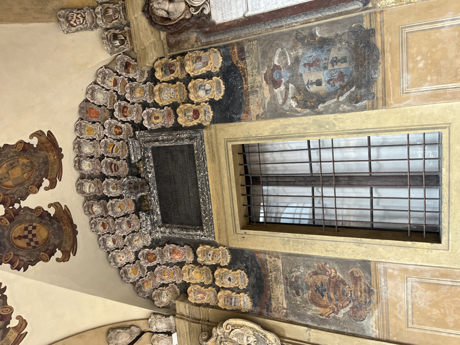 The image displays a richly decorated interior wall and arched ceiling within the Archiginnasio of Bologna, Italy