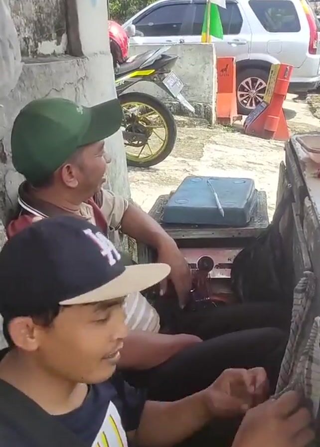 Two men are seated close together in a motorized pedicab. The man on the left wears a black baseball cap with a tan bill and a black t-shirt with white and yellow details. He looks downward and manipulates something in his hands. The man on the right wears a green baseball cap and a collared shirt with brown and red panels. He looks off to the left and rubs his nose with his index finger. A dark bag sits in front of them. Behind them is a covered metal box. A striped cloth hangs in the foreground obscuring the bottom of the scene. Outside the pedicab, there is a red motorcycle and a silver SUV. Indonesian flags wave in the background. The scene appears to be a street side.