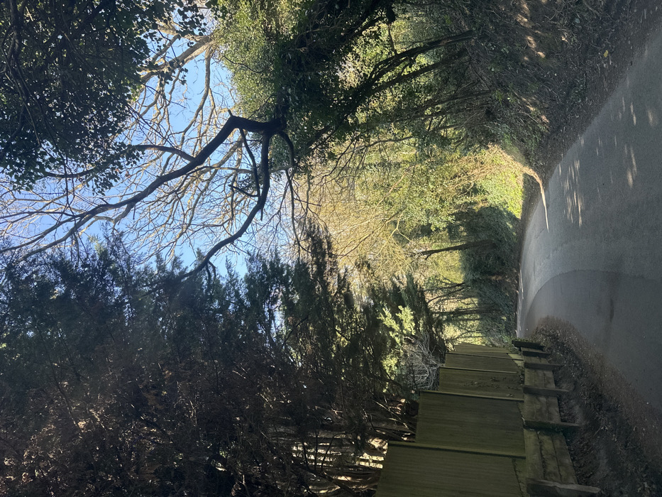 An asphalt road curves gently to the right and recedes into the distance in Upper Upnor, United Kingdom. On the left, a tall, light-colored wooden fence supported by horizontal wooden sleepers runs parallel to the road, partially obscured by dense coniferous trees and foliage behind it. This left side of the scene is predominantly in shadow. The right side of the road features a steep embankment covered in a mix of deciduous trees with bare branches and evergreen foliage, illuminated by direct sunlight, creating bright patches on the vegetation and dappled shadows on the road surface. A clear blue sky is visible through the tree canopy overhead. No individuals, vehicles, or animals are present.