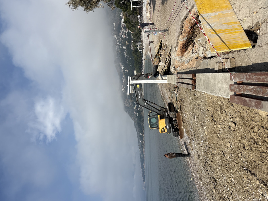 The image displays a coastal construction or demolition site along a promenade in Bar, Montenegro