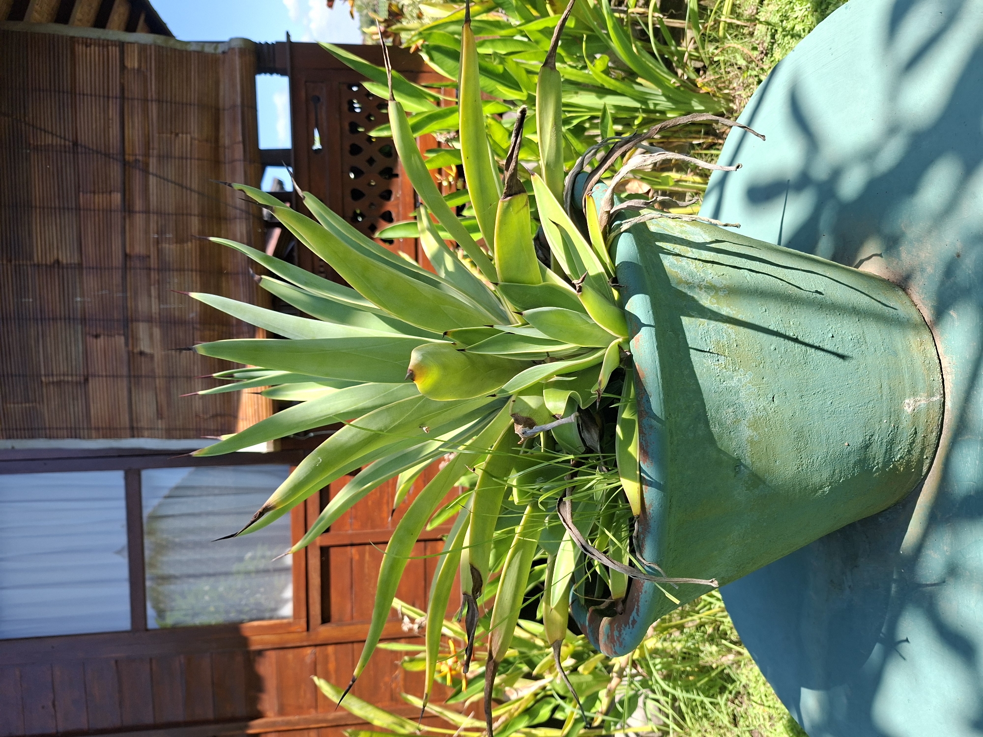 large green potted plant with long, pointed leaves. The pot sits on a teal-colored round surface, possibly a table. Behind the plant is a wooden structure, perhaps a building with a window. The photo was taken in Lodtunduh, Indonesia. The plant appears to be an agave type. There is other foliage surrounding the pot and wooden structure, including some dead fronds in the pot. The background is somewhat blurry but appears to be a yard or garden. The image is taken in daylight.