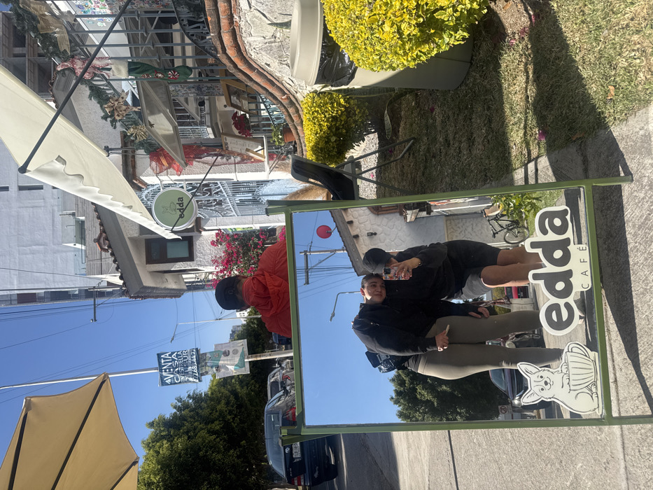 A reflective scene captures a sunny exterior. A couple in dark clothing stands before a framed mirror that displays "edda CAFE" and a corgi sticker. The mirrored background shows a street with parked cars, trees, and a building with festive decorations. A tan awning and street signs are visible. The actual background behind the mirror reveals an adjacent building with flowers and an object resembling a wheelbarrow.