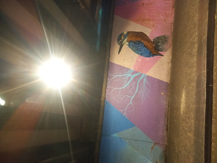 A mural depicts a bird, possibly a kingfisher, perched on a surface with abstract geometric shapes and pale blue branch-like designs. The bird is brown and blue. The mural has a rough texture. A bright light source obscures the left side of the frame, casting rays across the scene. The mural is bordered by stone on one side.