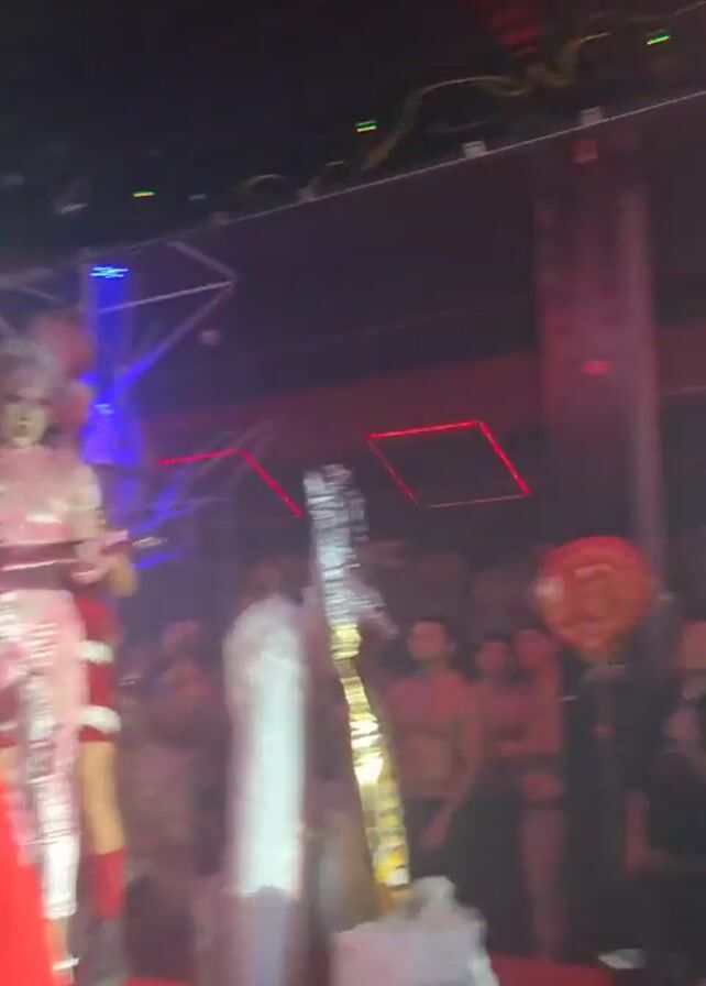 performance, probably at a club or party. In the first clip, one performer is dressed in a shiny pink costume and holds a pink toy gun as they stand behind a gold bowl. A man in a red and black leather outfit stands to their left holding a long stick, while another performer dressed in a similar red and black outfit stands to their right. The next clip shows another performer, in a black dress and horned headdress, holding a green, orb-like prop. The third clip is a wider view of a stage, showing two performers, one in pink and one in red and black, holding their props as they dance for the camera. Audience members stand in the background. There is a large metal structure and other decorations visible in the background.