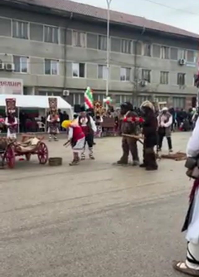 group of people dressed in traditional Bulgarian costumes performing a ritual in a town square. The costumes are elaborate, with large masks and colorful fabrics. Some of the performers are carrying wooden sticks, while others have bells attached to their belts. There is also a small wooden cart on display. The scene is festive and lively, with music playing and people moving around. In the background, there is a building with several windows and a few trees. The overall atmosphere is one of cultural celebration.
