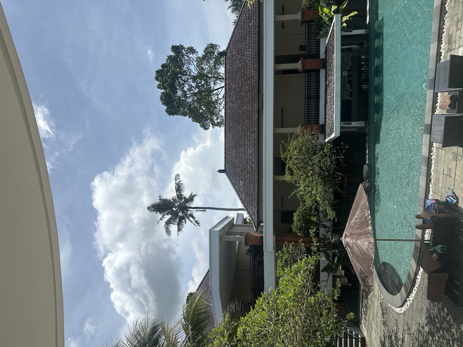 A sideways view captures a tranquil scene. A clear pool, bordered by tiled paving, reflects the sky. Buildings with red-tiled roofs line the pool, interspersed with lush greenery and trees, including a tall palm. Lounge chairs with towels sit poolside beneath a large umbrella. A cloudy sky dominates above.