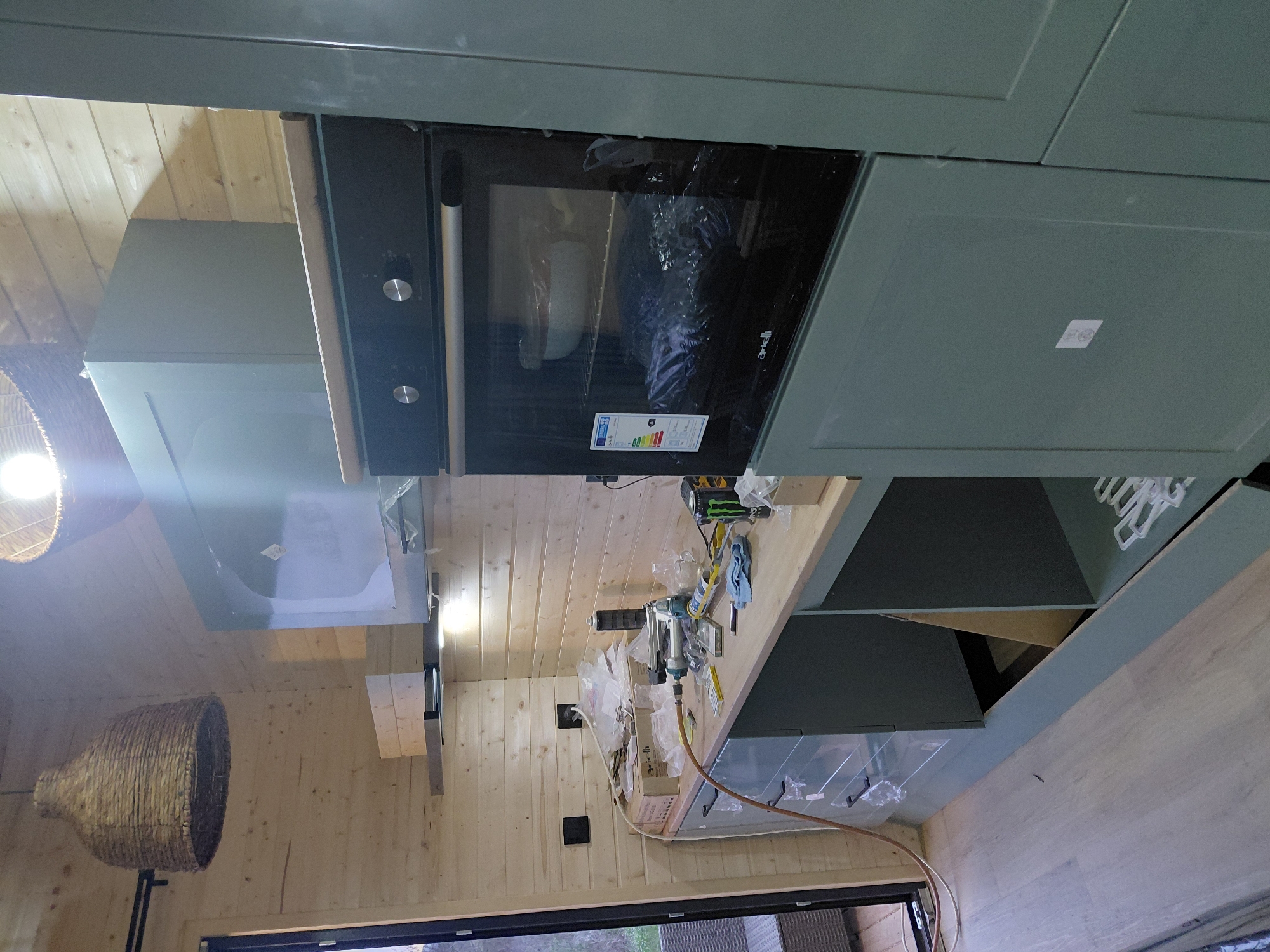 n interior space with wood-paneled walls and what appears to be a kitchen installation in progress. Above, there are blue-grey cabinets with an oven built in. The oven has a black glass door with a sticker on it, possibly an energy rating label. On the counter below, there are various tools and materials scattered about, including a nail gun, boxes, and plastic wrapping. A clear flexible hose stretches across the counter. There are hanging wicker baskets used as decoration. The image is taken at an angle, possibly from the floor looking up, or rotated for viewing purposes. The bottom of the image shows a window frame, providing a glimpse of an outdoor setting. There is no specific information to suggest this is in Tsarevo, Bulgaria.