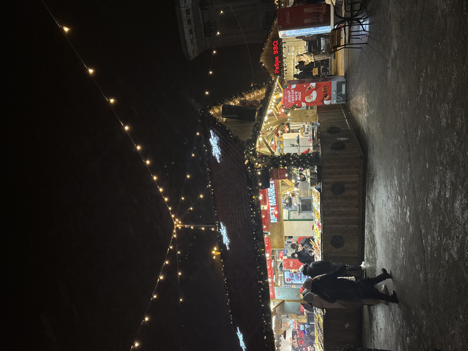 The image captures a nighttime scene at a winter holiday market in Kyiv, Ukraine