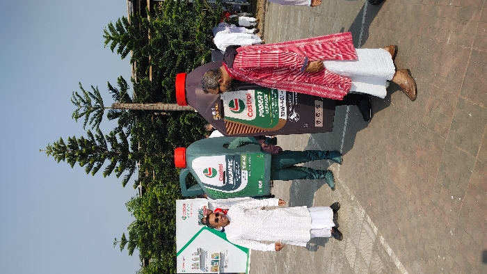Two people dressed as Castrol oil containers stand outdoors next to a promotional display