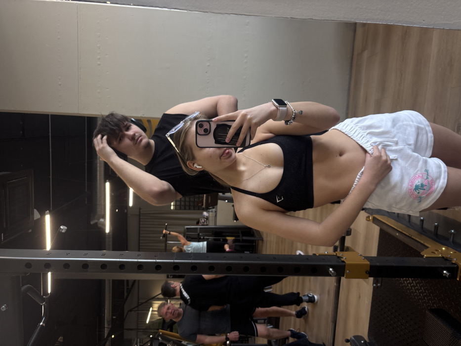 The image depicts an indoor scene within a fitness center, specifically identified as a Golem Club gym, likely the Golem Club Aupark location in Bratislava, Slovakia, based on the distinctive interior design, including black ceilings, light wood-effect flooring, and equipment styles. In the foreground, a young adult female is taking a mirror selfie, holding a pink-cased smartphone with her left hand. She is wearing a black halter-neck sports bra and white athletic shorts with a colorful emblem on the left thigh. Her hair is light brown, and she wears white earbuds, a silver necklace with a small pendant, and an Apple Watch with a silver band and charm bracelet on her left wrist. She is looking at her phone's screen and playfully sticking out her tongue. Her right hand is grasping the waistband of her shorts. Reflected in the mirror behind her is a young adult male, visible from the chest up. He has dark hair, is wearing black over-ear headphones and a black sleeveless shirt. He is looking towards the camera (the woman's phone) with his right hand raised, touching his hair. The background, also visible in the mirror's reflection, shows other gym patrons and equipment. To the left, a heavy-duty squat rack or power cage with black uprights and gold-colored structural elements is present. Further in the background, two adult males are visible: one in a grey t-shirt and black shorts, and another in a black t-shirt and black pants. A female in a light blue top is performing pull-ups on a bar in the central background. The gym features an open layout with a black ceiling, recessed lighting, and bright, light-colored walls.