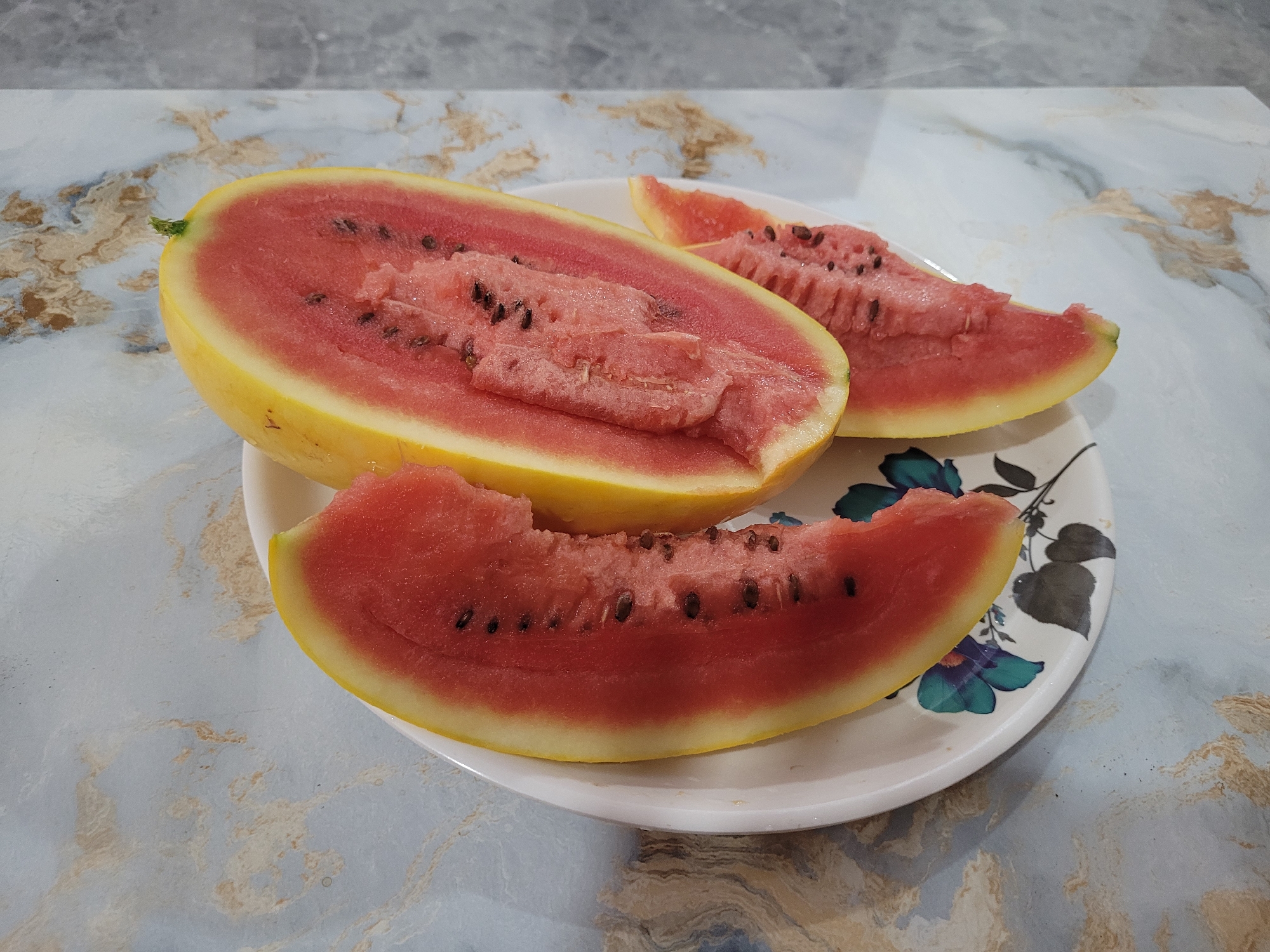 - "The image displays three cut pieces of a yellow-skinned watermelon on a white, floral-patterned plate, resting on a light-colored marbled countertop" by FM-avbBm1, licensed under CC BY 4.0