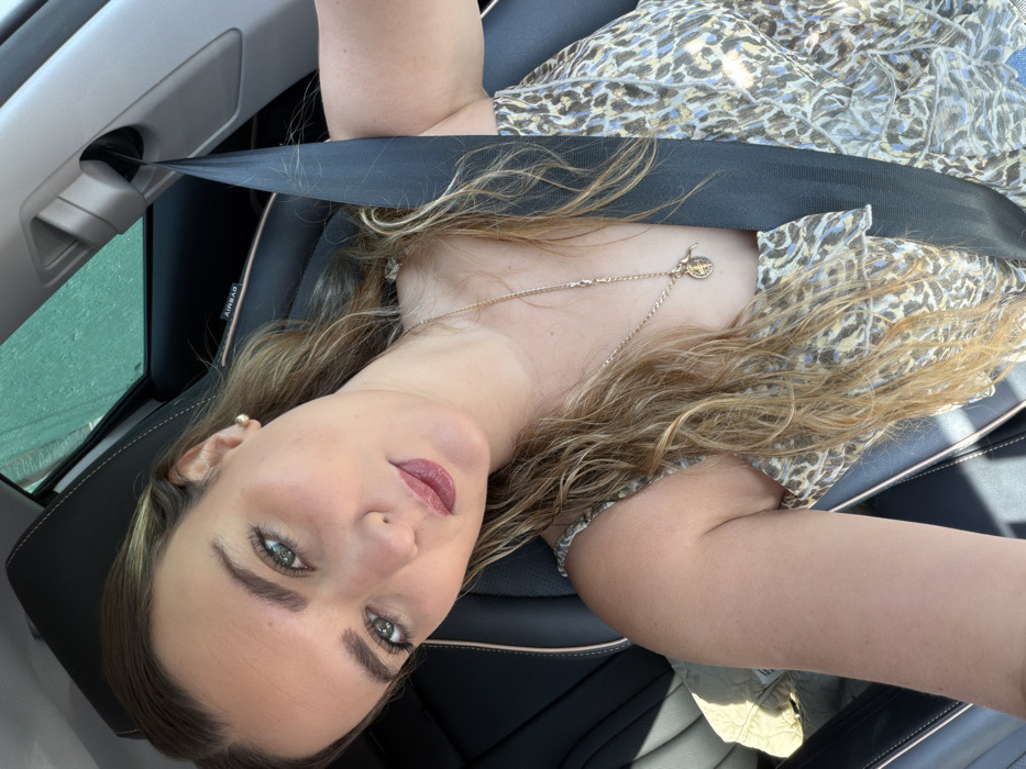 A fair-skinned woman with light brown hair and green eyes poses indoors, secured by a seatbelt. She wears a patterned blouse and a delicate gold necklace. Her face is partially turned, displaying soft lighting and a hint of lip color. The interior setting appears to be a car, suggested by the seat and window visibility, with a focus on safety.
