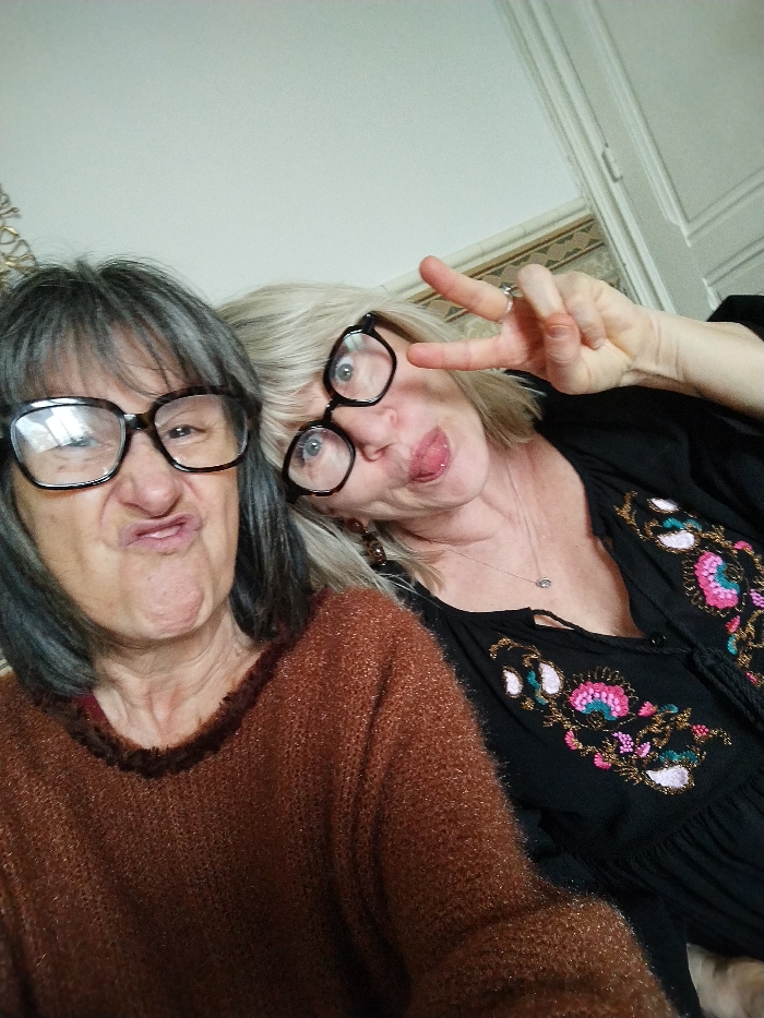 The image displays two adult females posing for a close-up photograph indoors in Montélimar, France