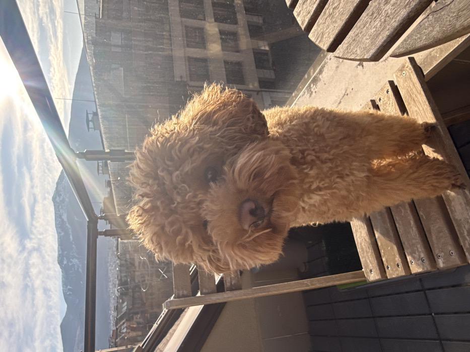 - "A small, apricot-colored poodle-type dog with curly fur stands on a wooden slatted chair, facing forward and slightly left, looking directly at the camera" by FM-y82gr1, licensed under CC BY 4.0