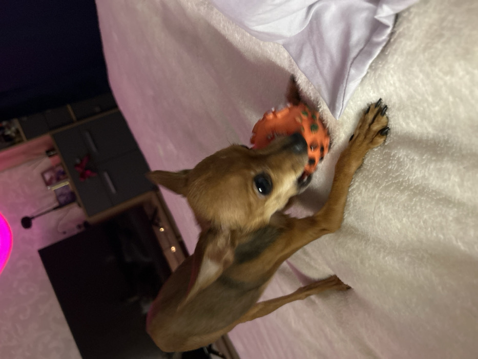 A small, tan dog holds an orange, textured ball in its mouth. The dog is lying on a white, textured blanket near a white pillow. Its black nails are visible on its front paw. In the background, partially out of focus, is a dark entertainment center with a television, decorated with small lights and pictures. Pink light fills part of the room.