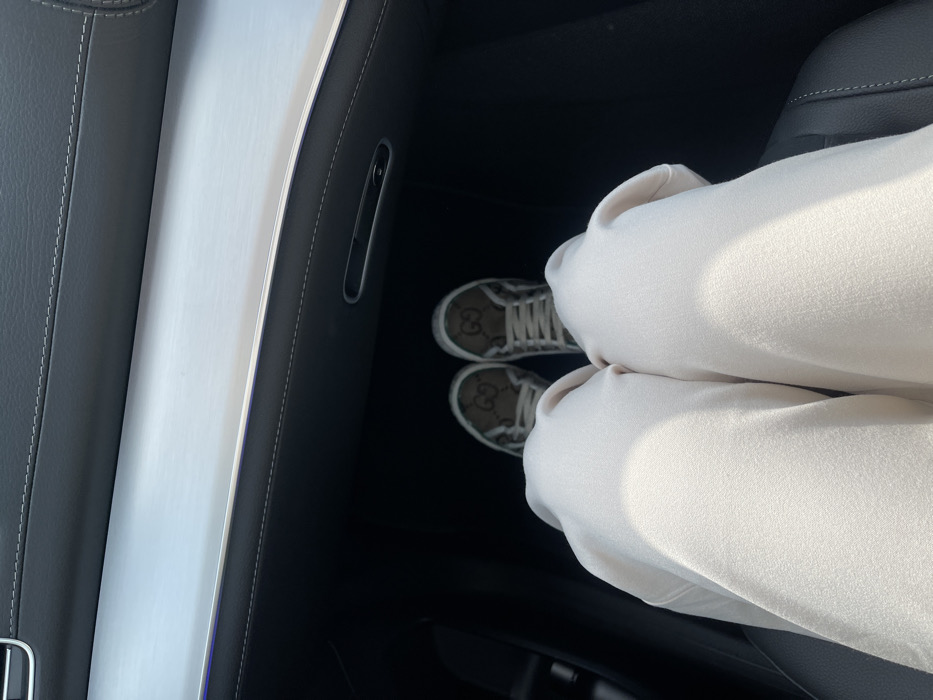 A person is sitting in the passenger seat of a vehicle, with their legs crossed