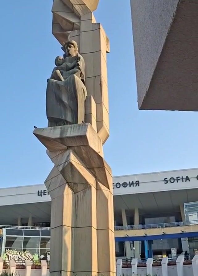 statue of a woman holding a child. It stands in front of a building that reads "SOFIA CENTRAL STATION." The statue is made of light-colored stone and has a modern, abstract design. The sky is blue and clear. The building is a long, modern structure with glass windows and a white exterior. There are plants and fences at the base of the statue. The camera is low, looking up at the statue and building.