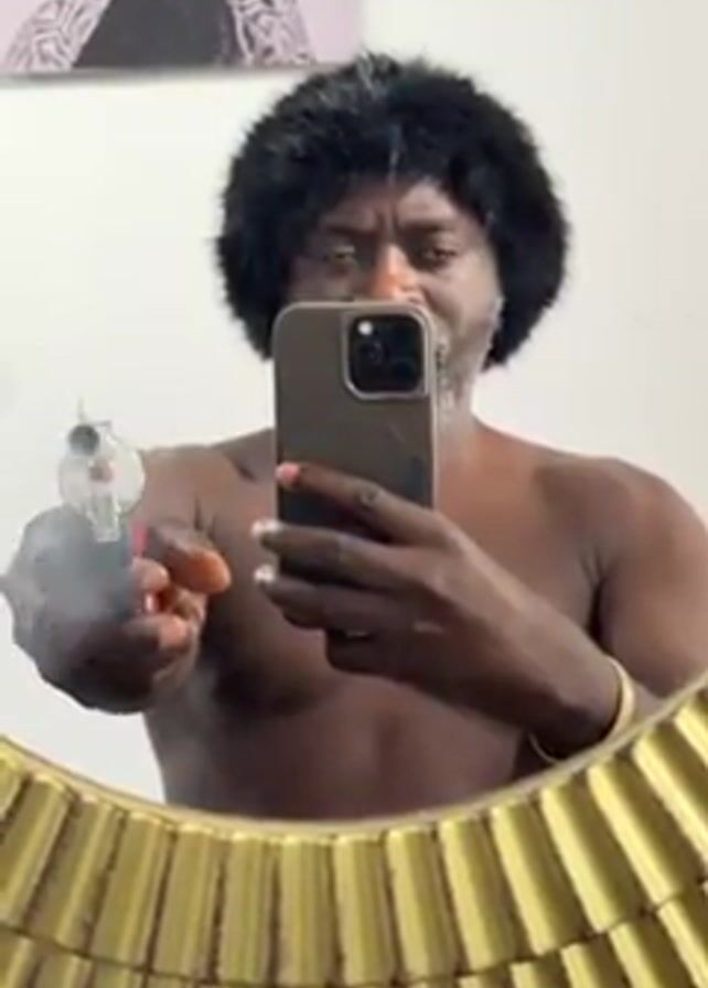 A man is taking a selfie in a mirror. He is wearing a black wig and has a gray beard. He is shirtless and holding a silver revolver in his right hand and a smartphone in his left hand. The background is a white wall with a painting hanging on it. The mirror has a gold-colored frame. A small child can be heard crying in the background. The man fires the revolver in the direction of the mirror.