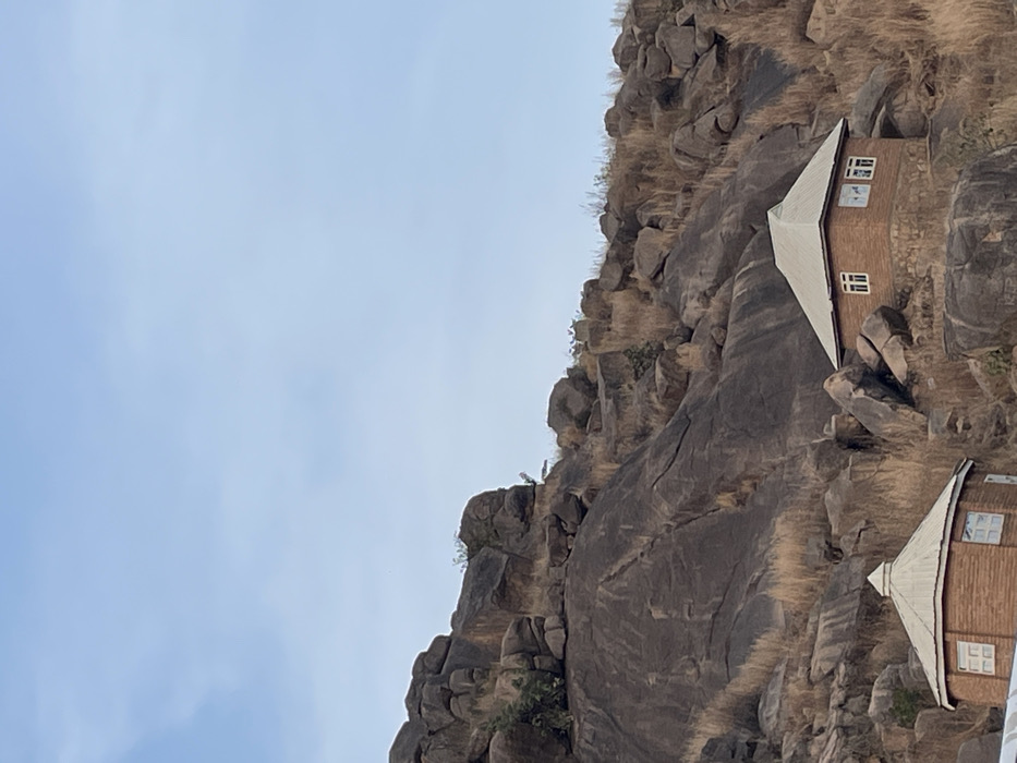 The image captures a rocky hillside landscape along Rukuba Road, Nigeria, under a clear, light blue sky. The terrain is dominated by large, weathered dark grey and brown rock formations. Sparse, dry golden-brown grasses and small green shrubs are interspersed among the rocks. Two structures are visible on the hillside. The more prominent building, situated in the mid-right, is a single-story dwelling with brick-patterned walls, a light-colored corrugated hip roof, and multiple white-framed windows. A second, partially obscured single-story building in the lower-left corner features similar brick-patterned walls, a light-colored conical roof, and white-framed windows. No individuals or discernible activities are present in the scene.