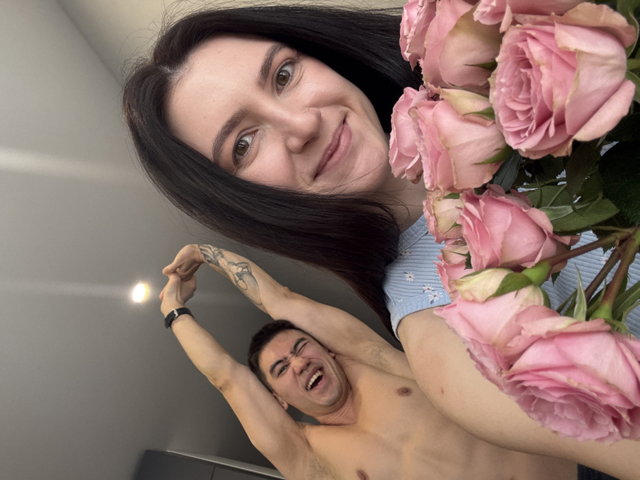 A selfie-style photograph, taken indoors, depicts two individuals. In the foreground, a woman with long, dark hair, light complexion, and brown eyes smiles directly at the camera. She is wearing a light blue ribbed top with small white floral patterns and has a nose piercing on her left nostril. She holds a large bouquet of light pink roses, which occupy the lower right portion of the frame. In the mid-ground, to the left and slightly behind the woman, a shirtless man with short, dark hair is visible. He is making an exaggerated facial expression with his mouth open and eyes squinted. His right arm is raised and bent over his head, with his hands clasped. He wears a black wristband on his left wrist, and a tattoo is visible on his right upper arm. The indoor background consists of a plain light-colored ceiling with a single recessed light fixture emitting a warm glow in the upper left. A dark grey or black surface is partially visible in the far left background. The specific location within Kazan, Russia, cannot be determined from the visual information present in the image.