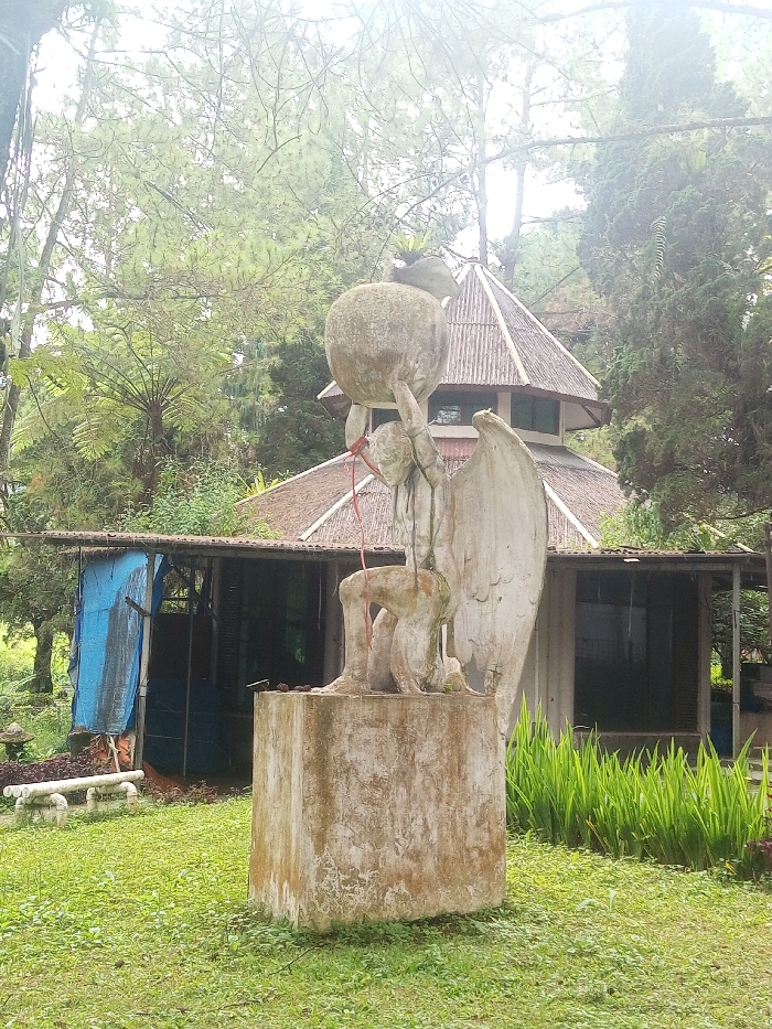 The image displays a weathered concrete statue situated on a green lawn in Nuwara Eliya, Sri Lanka. The statue, depicting a crouching, winged figure, holds a large, rough spherical object overhead with both hands. A red cord or string is visible hanging from the figure's neck area. A small, dark bird is perched on top of the spherical object. The statue rests on a rectangular concrete plinth, both surfaces exhibiting significant moss and weathering. In the mid-ground to the left of the statue, a low, white concrete bench is present. Behind the statue, two distinct structures are visible. The central building features an octagonal base with a multi-tiered, conical roof constructed from corrugated material, and windows with dark panes. To its left, a smaller, single-story building is partially obscured, with a blue tarpaulin serving as a wall or covering on its left side. The entire background is dominated by dense, lush green vegetation, including tall conifer trees, large fern-like plants, and various undergrowth. The sky is overcast, providing diffuse lighting to the scene. No human subjects are present.