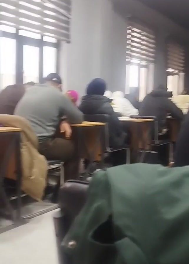 classroom or library setting with several people seated at individual desks. The room is well-lit with natural light coming through windows covered with blinds. Most of the people are facing forward, presumably working or studying. Several are wearing jackets or hats. The perspective is from behind someone seated in a chair, partially obscuring the view with the back of the chair and a green jacket draped over it. There is a general air of quiet activity.