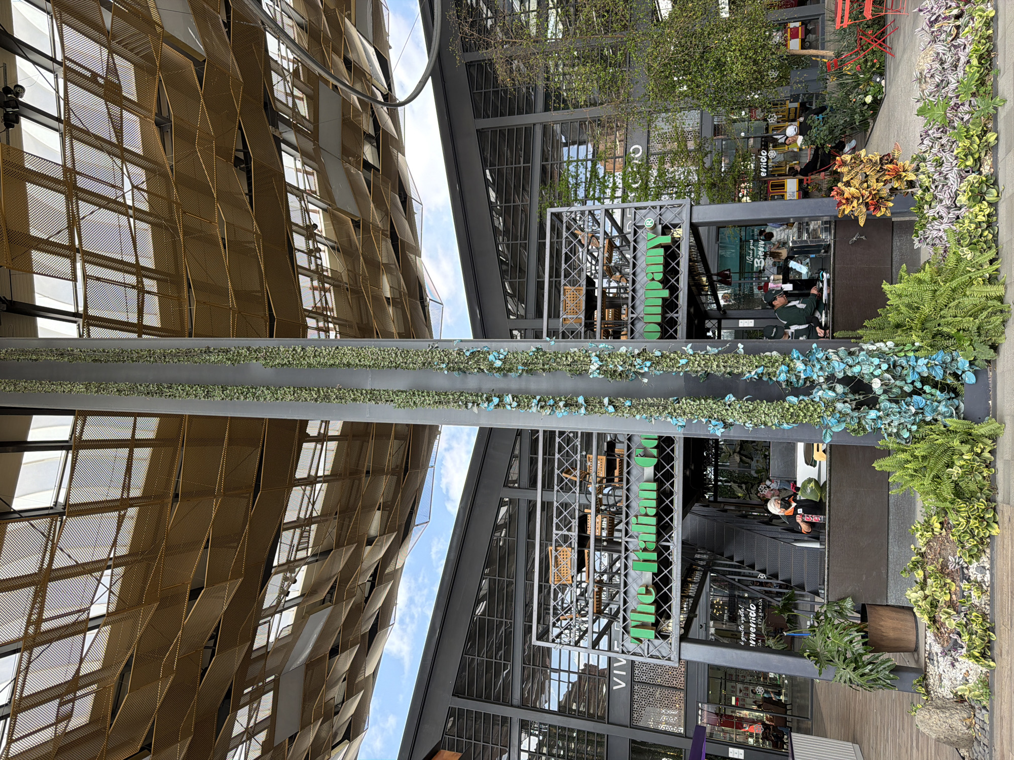This outdoor shot shows a section of a building facade and an adjacent structure decorated with greenery, seemingly located in San Pedro Cholula, Mexico. The building on the left has a textured, patterned facade with a gold-colored, woven design over its windows. To the right is a modern, steel-framed structure identified as “The Italian Co” by a large sign. The pole supporting the sign is adorned with garlands of artificial flowers and foliage. People are seen inside the restaurant, some seated at tables. The streetscape includes vegetation.