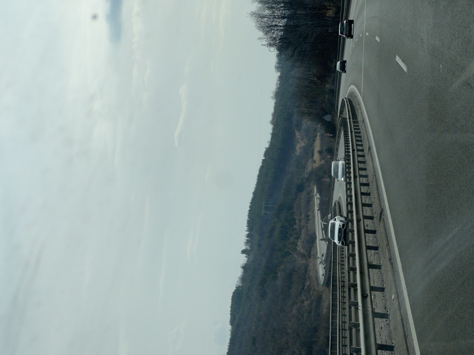 The image displays a multi-lane highway segment in Pernik, Bulgaria, under an overcast sky. The foreground features a dark asphalt road curving to the right, marked with white solid and dashed lines. A metal guardrail runs along the left side, separating the viewer's perspective from a lower, parallel curving road. On this lower road, a white Mercedes-Benz sedan is visible, traveling towards the viewer, followed by a light-colored minivan. Further on the main highway, two dark-colored sedans are observed receding into the distance. The background is dominated by an extensive hillside covered in sparse, predominantly bare deciduous trees, with some evergreen clusters. Utility poles and power lines are faintly discernible on the hillsides. On the far right, a group of bare trees borders the highway. No individuals are present.