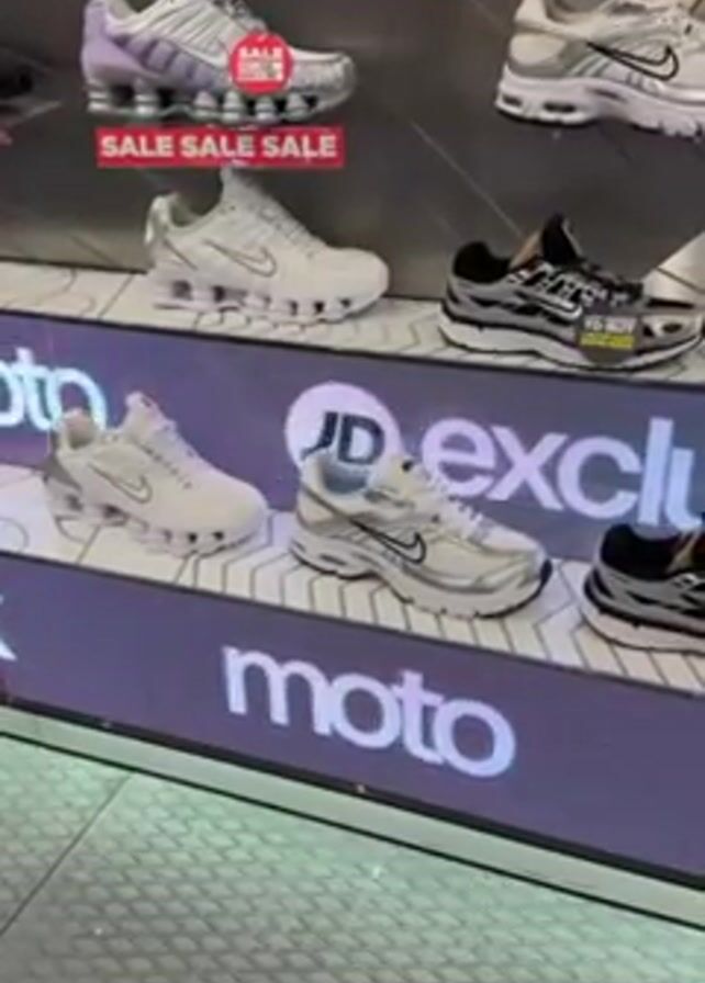 The camera shows a display of athletic shoes in a store, likely JD Sports, as suggested by the branding