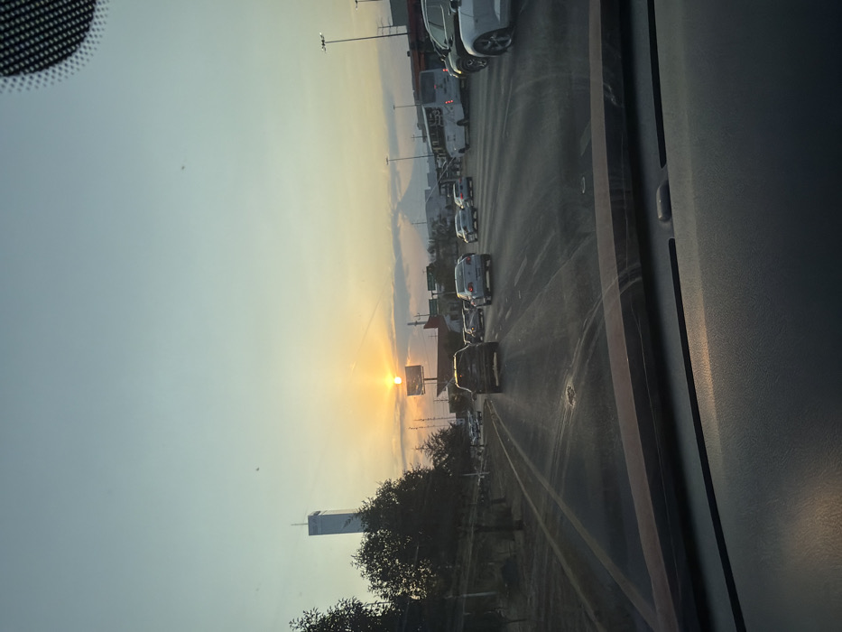 A sunlit street view, taken from inside a vehicle, shows a line of cars moving toward the bright sun on a multi-lane road. A tall building rises to the left of the sun, partially obscured by trees. A dark dashboard and a portion of a window frame are visible in the foreground. The sky is clear, transitioning from a light blue to a yellow-orange hue near the horizon.