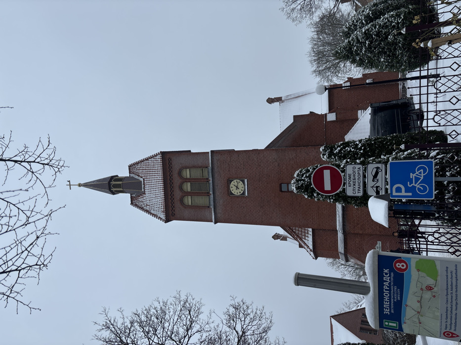 The image displays a winter street scene in Zelenogradsk, Russia, featuring the Transfiguration Cathedral (formerly St