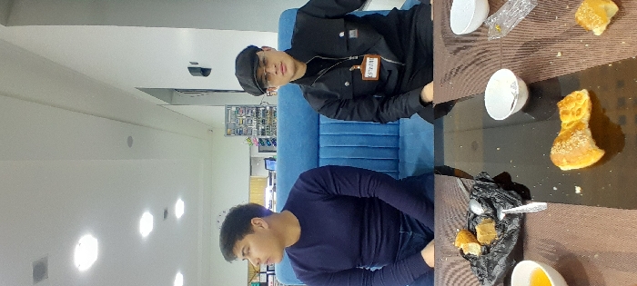 Two men sit on a blue sofa by a glass table. The man on top wears a black jacket and hat with glasses. He has a name tag. Below him is a man in a blue shirt. The table has a brown mat with a snack plate on the lower right. It also has white bowls and pieces of bread scattered around. A black plastic bag is seen with food and a spoon on the table.