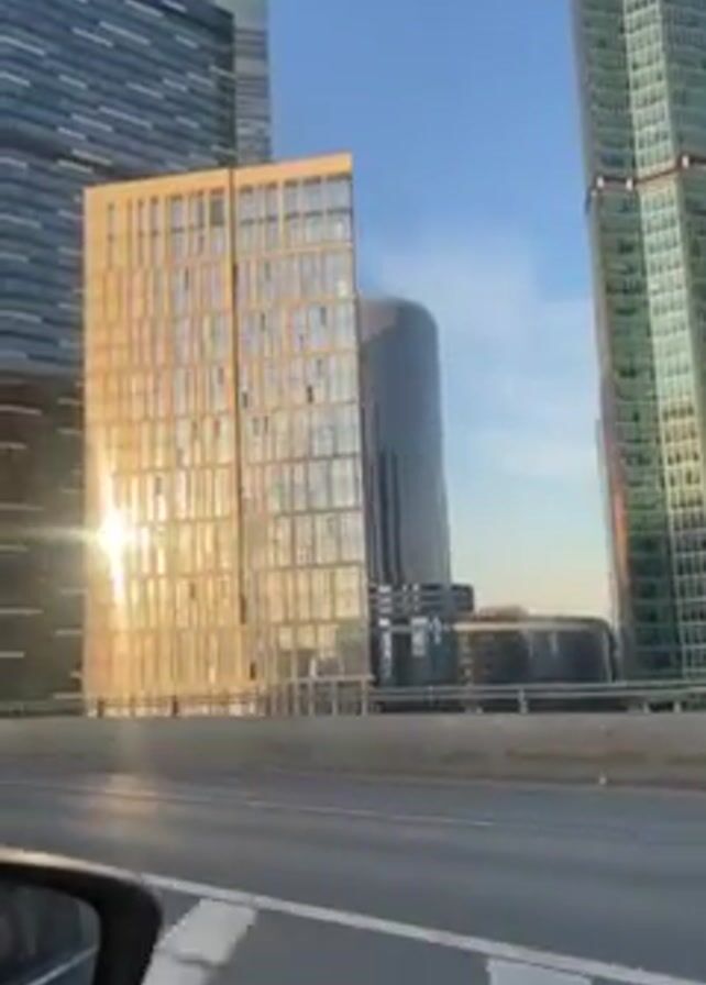 The video is shot from a car moving on a highway in a city with modern skyscrapers. The buildings are made of glass and metal, reflecting sunlight. One building is gold-colored, and another is blue. The sky is clear and blue. A road sign is visible. The driver's side mirror of the car is in the corner of the frame.
