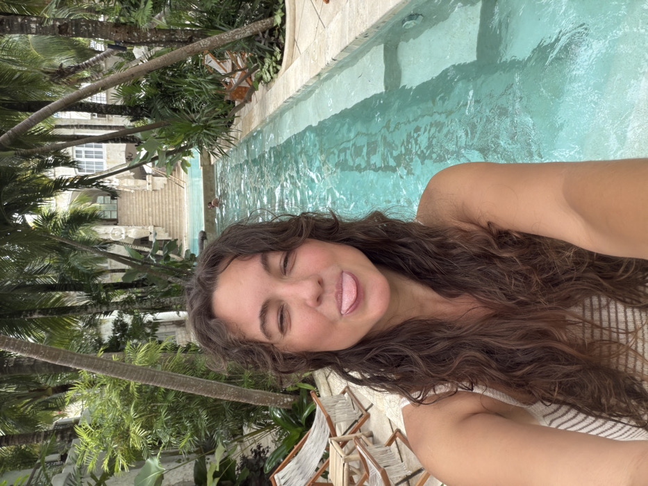 A woman with curly brown hair poses for a selfie at a resort. She sticks out her tongue and winks. A turquoise pool stretches behind her, lined with palm trees. Lounge chairs sit on the patio. The architecture suggests a luxury hotel, with a view of stairs and a multi-story building in the background.