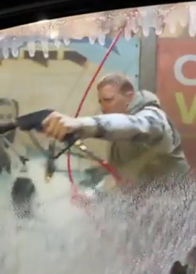 car window being cleaned at a car wash. Outside the window, a man in a light-colored jacket is using a cleaning tool with a brush to scrub the window. Foamy liquid and water run down the window as he cleans. In the background, behind the man, there is a red circular design and part of an advertisement with a woman’s face. The camera is positioned inside the car, looking out.