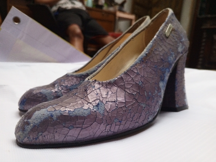 A pair of worn women's heels sits on a white surface. The shoes are a cracked, iridescent purple color with hints of blue. They feature rounded toes and thick, block heels. A small, rectangular metallic detail adorns the side of one shoe. The shoes appear aged and possibly distressed. A person, laptop, and furniture are visible in the blurred background.