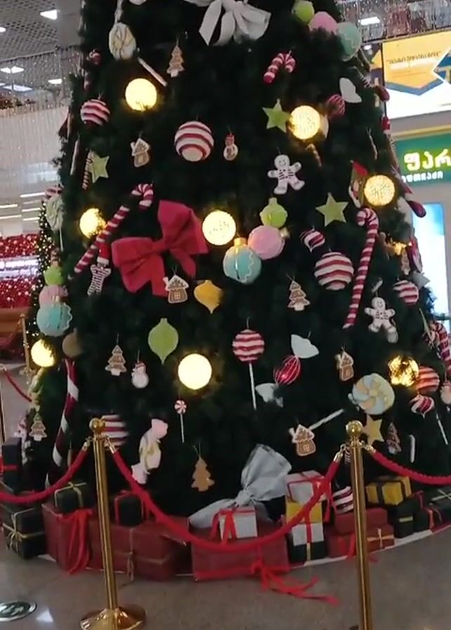 large Christmas tree in what appears to be a shopping mall or airport. The tree is decorated with a variety of ornaments, including candy canes, gingerbread men, striped balls, and white bows, and is lit with warm white lights. There are wrapped gifts placed around the base of the tree, which is enclosed by gold stanchions with red rope. The surrounding area is brightly lit, with other shops and decorative elements visible in the background. The camera slowly pans up to show the top of the tree.